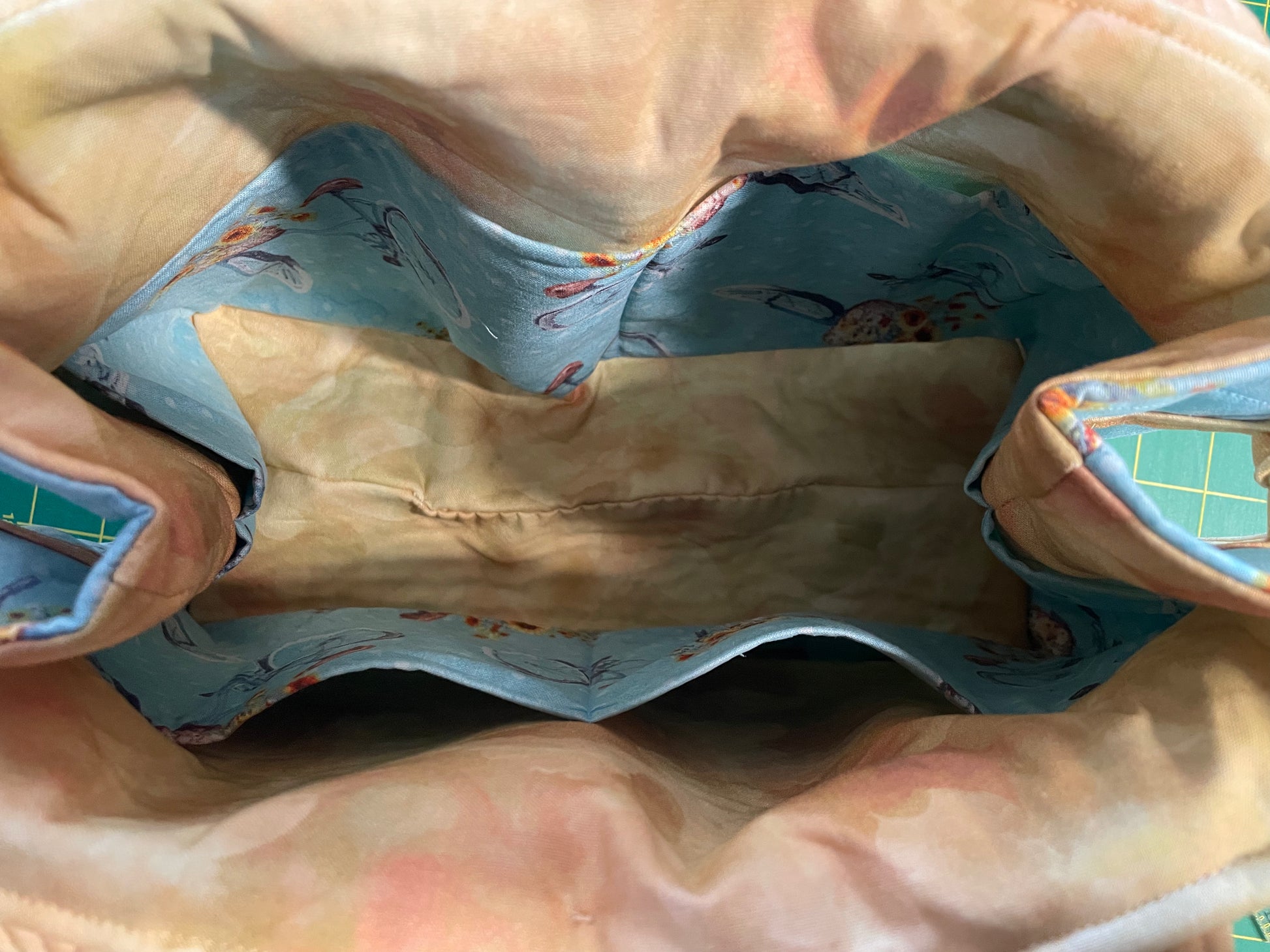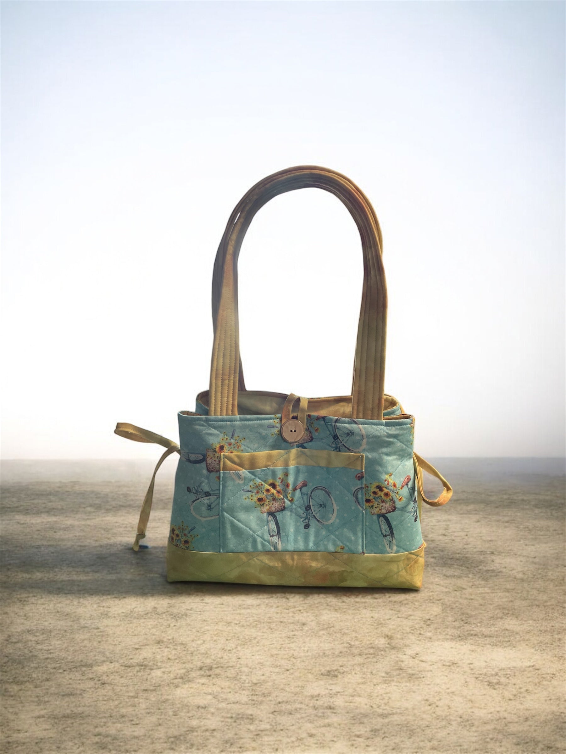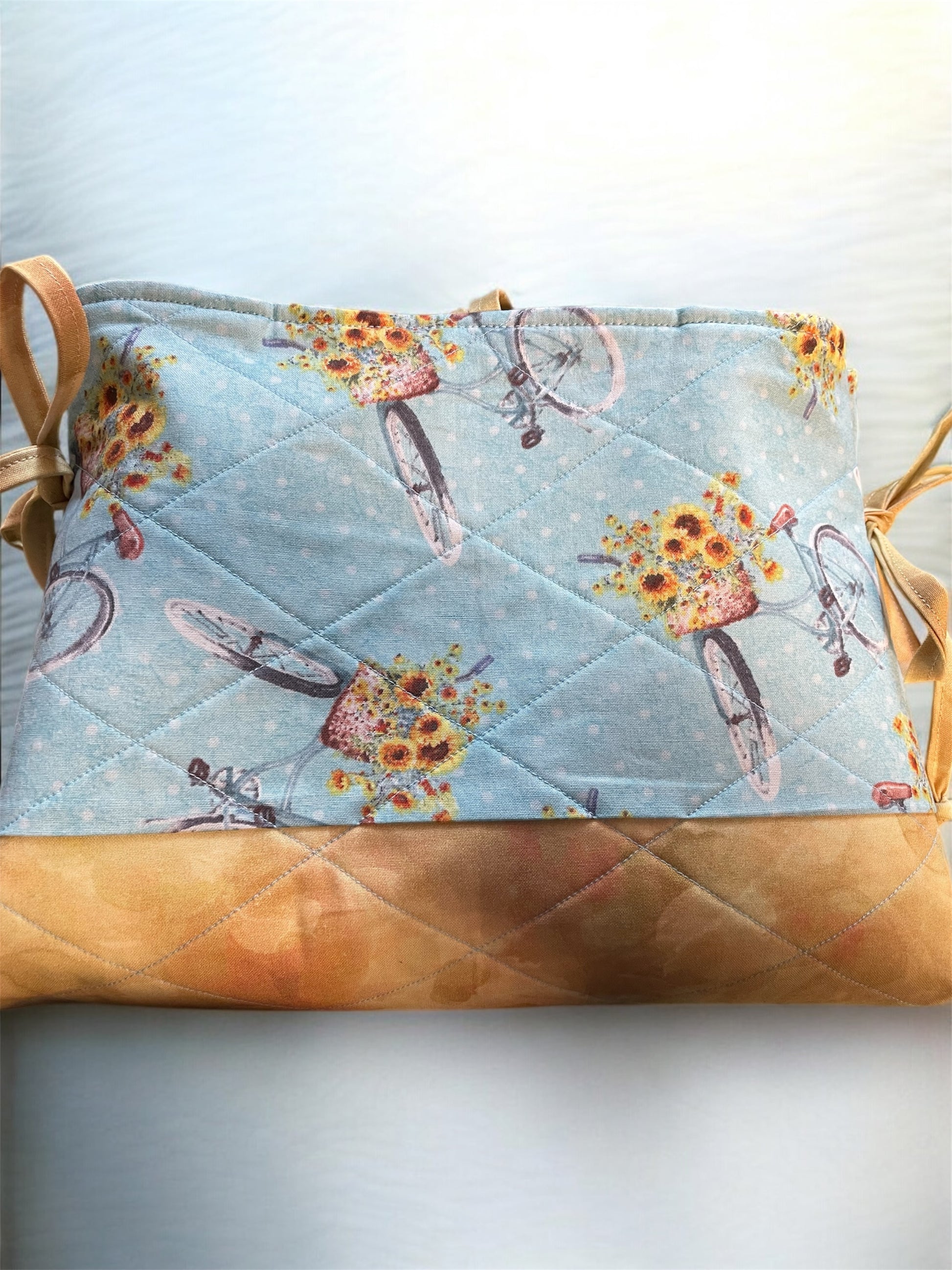 This is a popular style bag homemade by Amy. It measures approximately 11” wide, 10” tall and 5” deep. The bicycles make for a fun spring bag. There is one outside pocket and 6 inside pockets.