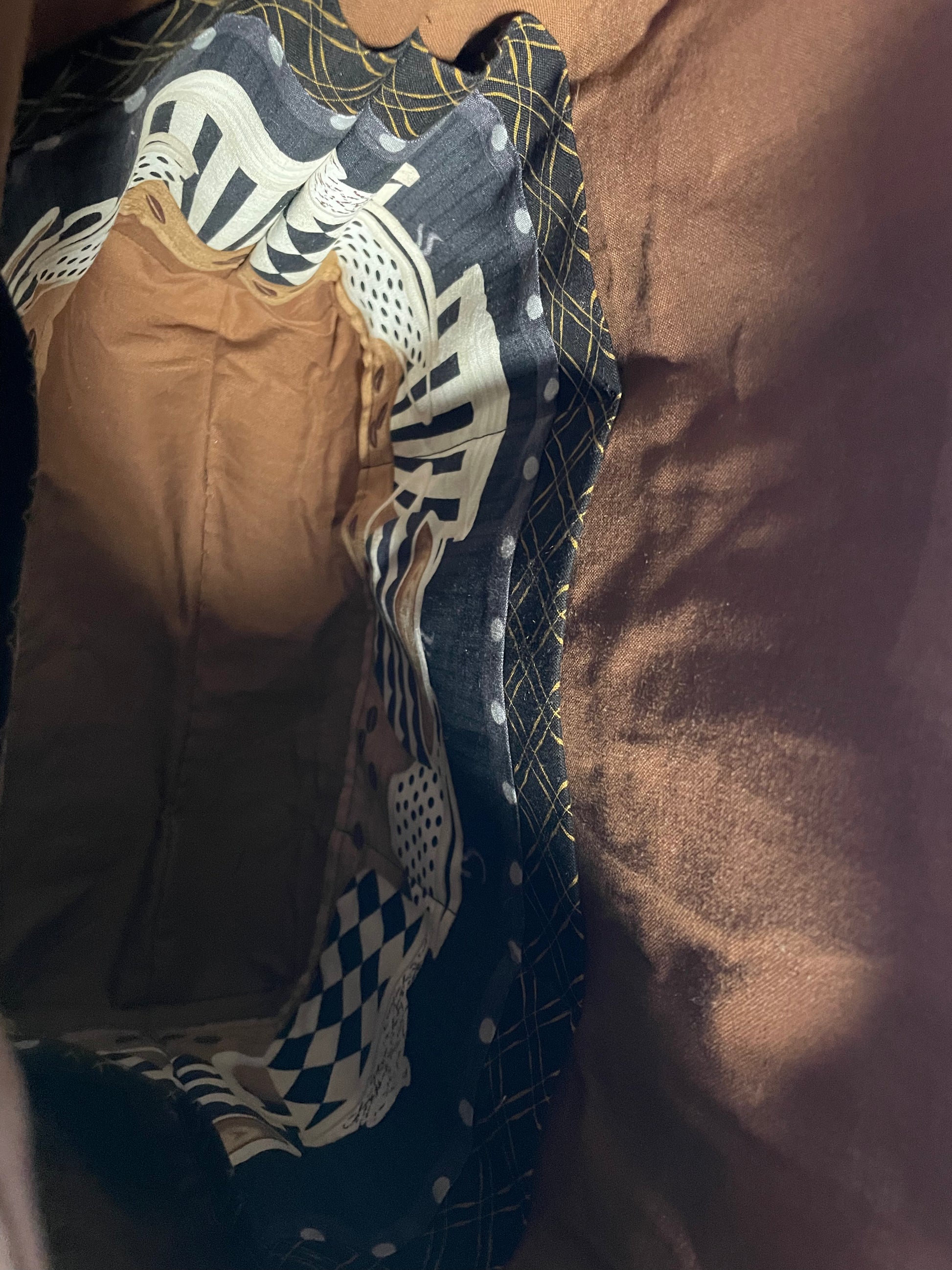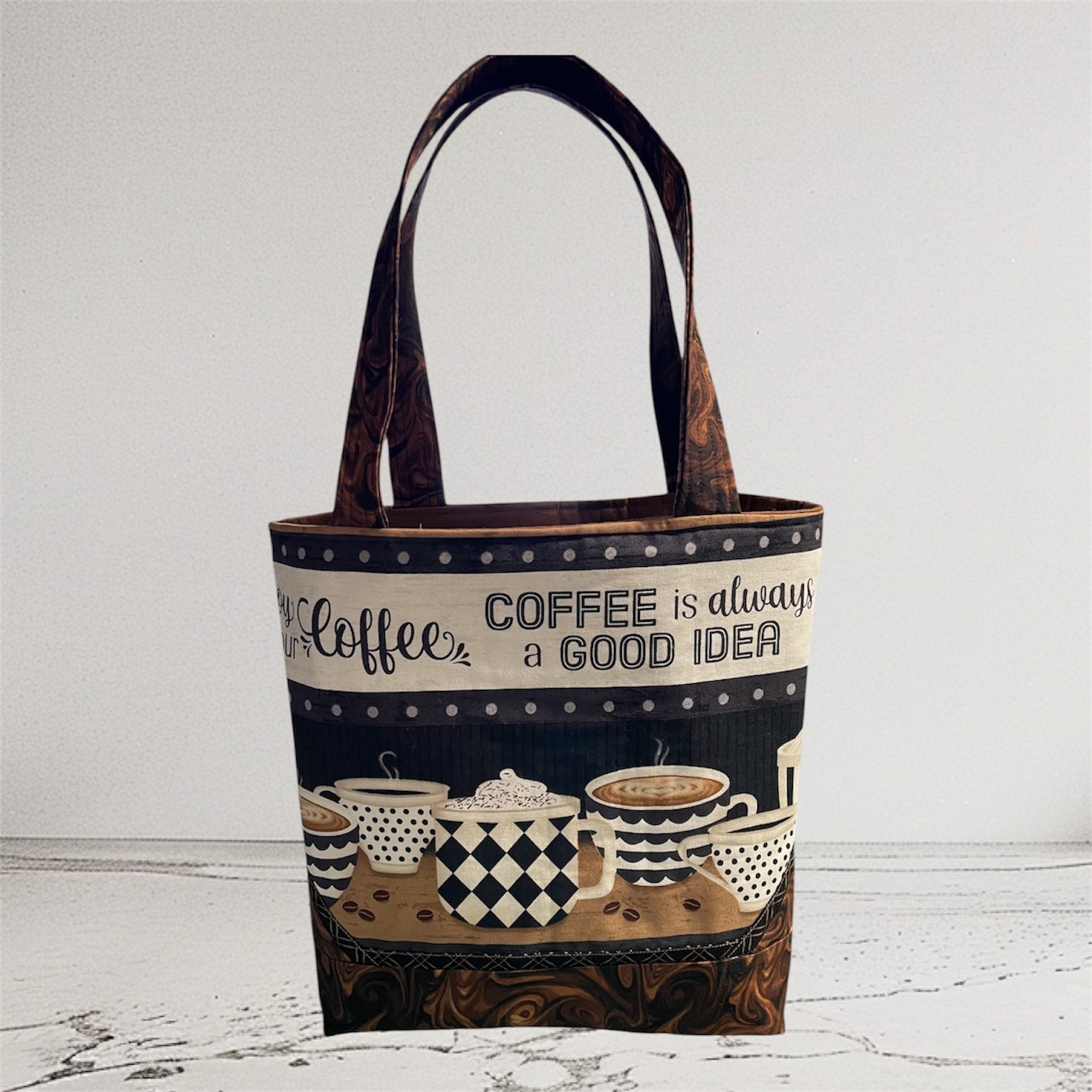This is a bag homemade by Amy. It measures 11” wide, 12 1/2” tall and has a 4” gusset. There are 6 pockets on the inside. Great for someone that loves coffee.