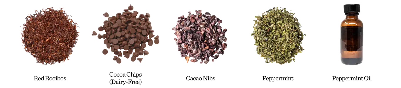 SWEET-MINT · CREAMY COCOA · BRIGHT FINISH. Peppermints plunging in dark chocolate decadence "This tea is a perfect blend of cool peppermint and rich chocolate. It’s refreshing and comforting all at once—the kind of tea I could enjoy any time of the year. It takes me back to summer evenings, sitting at a sunset picnic with friends, eating mint chip ice cream and laughing as the sky turned pink and stars began to glow. It brings back memories of December nights as a kid— wrapped in flannel pajamas at my school's holiday movie night, sipping hot cocoa and swirling it with a candy cane as we all grew in anticipation for Christmas Day. I think of my hometown Christmas parade too— standing with loved ones, sipping a cup of mint cocoa, lights twinkling, bands playing carols, and smiles all around.