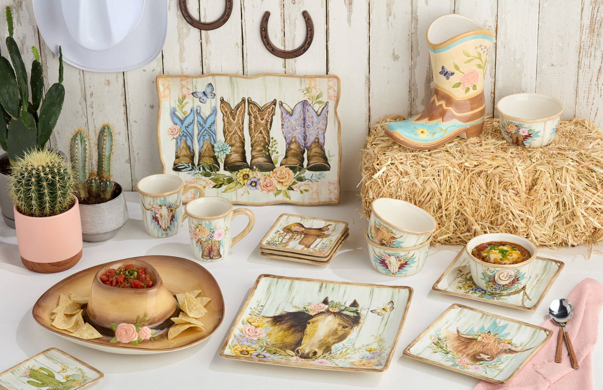 Enhance your table setting with the Rosewood Ranch Rectangular Platter, a 14" x 10" piece that blends art and functionality. Featuring a floral arrangement adorning a longhorn’s horns, paired with a fluttering butterfly, this platter is a true work of art. Perfect for serving hors d'oeuvres, desserts, or side dishes, its versatile size makes it an essential addition to your dinnerware collection. The durable design ensures long-lasting use, while the dishwasher-safe finish makes cleanup effortless. Whether used for casual meals or elegant gatherings, this platter adds a touch of rustic elegance to your dining experience. Pair it with other pieces from the Rosewood Ranch collection for a coordinated and stylish table that celebrates the beauty of nature and the charm of the countryside.